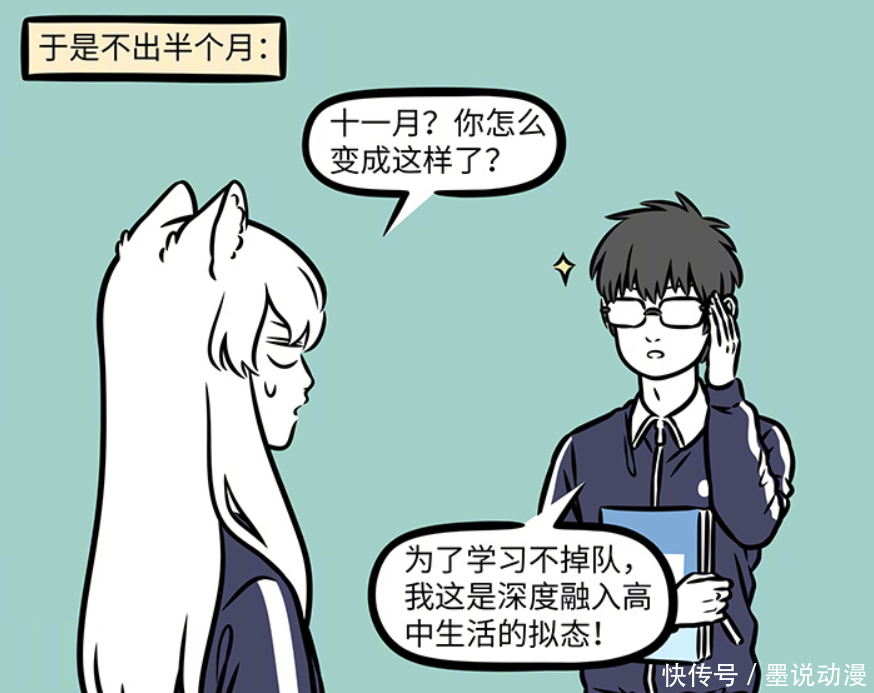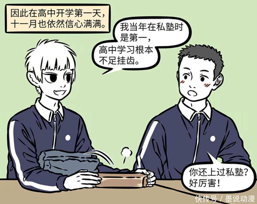 《非人哉》第1133话更新,十一月在高中时期为何那么厉害?原来从小就过目不忘,深受老师喜欢。刚上高中的十一月,一度陷入困境。文具跟不上时代,习惯难以改变,哪怕吃饭都追不上同学们的脚步。不过也是这时候,十一月为了让自己进入学习的状态,彻底改变了形象。