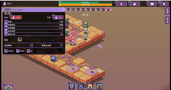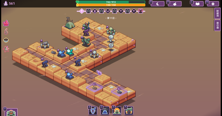 本作是一款舞台设定在外星世界的肉鸽塔防游戏,游戏的地图很容易让人想到陷阵之志亦或是皇家骑士团这类SRPG游戏。但这里的高低差只会对防御塔构成影响而已。每一局游戏开始时,玩家只需要在很狭小的空间内布置防御塔,然后到夜晚抵御外星敌人的来袭。但随着游戏进度的推进,玩家可以一块一块的探索地图,扩大自己要守卫的战场。探索地图时也可以获得肉鸽buff的增益。不同的防御设施也可以根据需求让其去专门针对特有的敌人,比如优先攻击近距离的,或者优先攻击血量低的。可以说游戏也提供了不小的策略空间。游戏上手不难,可玩性也还不错。喜欢紧凑型塔防的玩家可以试试。