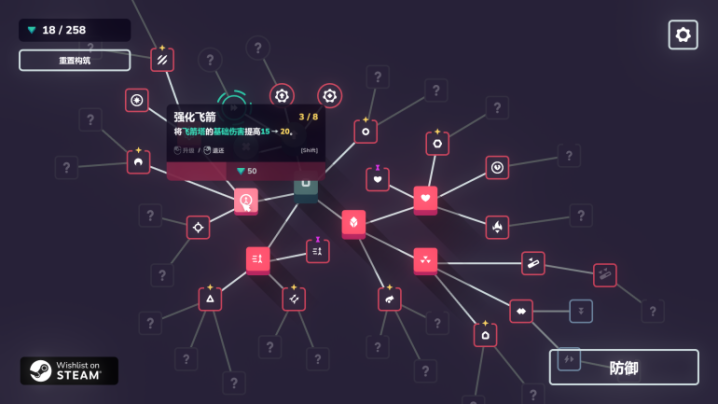 同时,我们所有点的技能都可以一键收回,重新分配。也就是说,游戏非常鼓励你反复尝试调整加点挑战关卡,乐趣是决策到实践这一过程。输了就拿着奖励的技能点继续发育,反正重开一局的时间成本和心理成本都不高。可以体验到越战越勇的增量爽感。非常推荐!