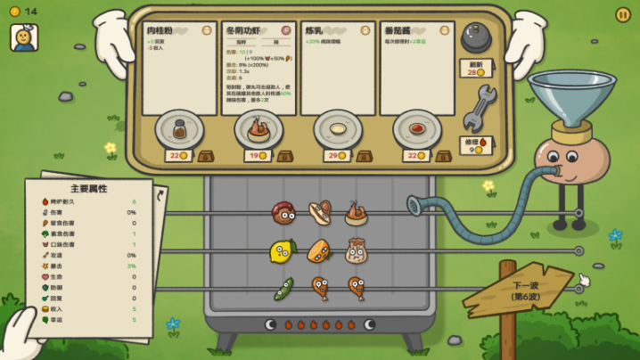 当然,游戏最让人感觉富有灵魂的地方是,所有烧烤食材的效果设计都很有说法,比如为什么橙子会带来范围酸性伤害?因为它吃起来会爆汁嘛,为什么饮品西瓜汁会增加口味伤害,但同时会减少荤食伤害?因为西瓜汁味道确实不错,但是也很解腻嘛。吃多了会觉得齁的炼乳会增加咸度攻击、提升底味但吃多了会很咸的酱油既能提升攻击,又会影响百分之1收入结算好像很合理。因为辣会传导,所以冬阴功虾发射的子弹不仅可以击退敌人,被击退的其他敌人也会受到辣味伤害也没毛病。可以说制作者要么是老吃家,要么就是个烧烤爱好者。这“吃以致用”的本事让玩家多了一个全新的视角来理解buff伤害。游玩过程中也能感觉到开发者或许是受到了PVZ的一些启发。还是蛮新颖的。目前有免费demo可以限时体验,感兴趣的玩家可以试试~